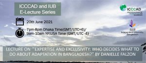 ICCCAD and IUB E-Lecture Series LECTURE ON "EXPERTISE AND EXCLUSIVITY: WHO DECIDES WHAT TO DO ABOUT ADAPTATION IN BANGLADESH?” BY DANIELLE FALZON The ICCCAD and IUB E - lecture series is a series of monthly, online lectures with renowned experts working in the field of climate change and development. The lectures provide an opportunity to …