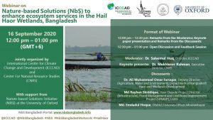 Center For Natural Resource Studies (CNRS) and International Centre for Climate Change and Development (ICCCAD) will be organizing the first webinar under this NbS Bangladesh Network webinar series on “Nature-based Solutions (NbS) to enhance ecosystem services in the Hail Haor Wetlands, Bangladesh”. The webinar will be conducted through zoom platform on Wednesday, 16 September 2020 …