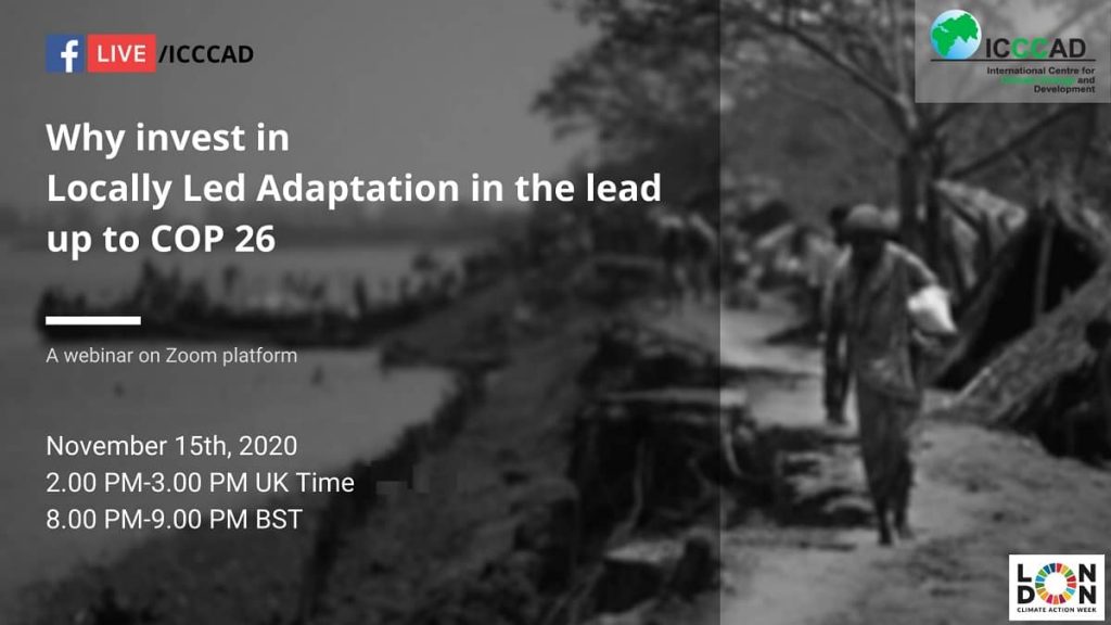 International Centre for Climate Change and Development (ICCCAD) is going to organize Webinar on Why invest in Locally Led Adaptation in the lead up to COP 26. Date: 15 November 2020 (Sunday) Time: 8:00 pm - 9:00 pm Bangladesh Time (GMT/UTC +6), 2.00PM-3.00 PM United Kingdom (GMT) Where: Online, using Zoom Under Theme 1: Green Fair …