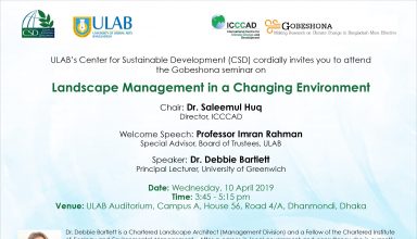 Gobeshona Monthly Seminar Hosted By: ULAB Presentation title: Landscape Management in a Changing Environment Presenter:  Dr. Debbie Bertlett, Principal Lecturer, University of Greenwich Chair: Dr. Saleemul Huq, Director, ICCCAD, IUB  Seminar Venue ULAB Auditorium, Campus A, House 56, Road 4/A, Dhanmondi, Dhaka 1205 Map of the seminar venue here ————–  Please R.S.V.P. to gobeshona.bd@gmail.com  ————–