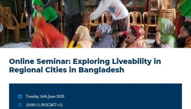 SHLC, University of Glassgow is organising a webinar on the ‘Exploring Liveability in Regional Cities in Bangladesh‘ mostly focusing on the outputs and experience from Liveable Rigional Cities in Bangladesh project. Event Link: http://www.centreforsustainablecities.ac.uk/events/interdisciplinary-exploration-liveability-regional-cities-bangladesh/ Date: 16th June, 2020. Time: 10:00-11.30am (UK time) Online via Zoom (link sent to registration) Register via Eventbrite Speakers: Dr. Hanna Ruszczyk, Istiakh Ahmed, Dr. Alex Halligey
